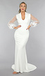 Deze lange jurk is gemaakt van een effen gladde stretch stof. Hij heeft een aansluitend model en de top is voorzien van een diepe V-hals. Hij heeft unieke wijde chiffon pofmouwen welke afgewerkt zijn met geborduurde details. De rok van de jurk is voorzien van een lange royale sleep en de jurk beschikt over een blinde ritssluiting op de rug waardoor de jurk gemakkelijk aan- en uit te trekken is.