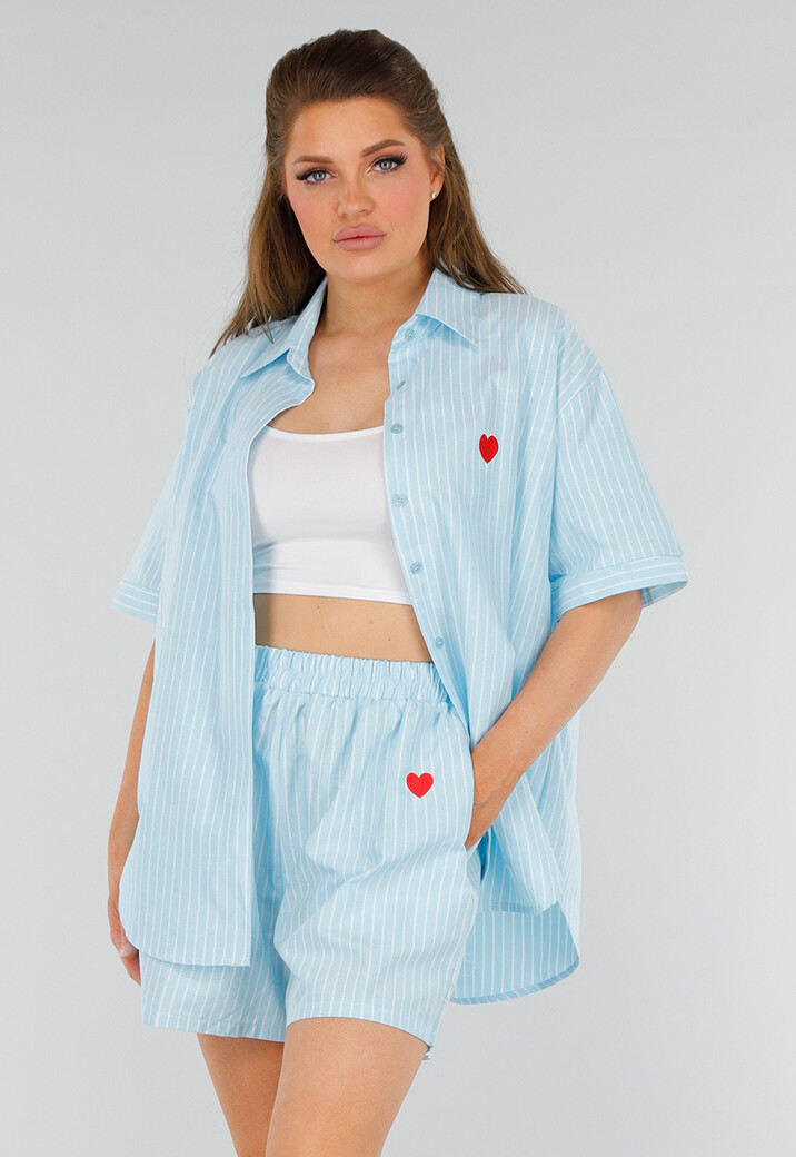 Deze azuurblauwe gestreepte katoenen two piece is voorzien van een oversized blouse met klassieke kraag, afgeronde onderkant en knoopsluiting in dezelfde kleur, en een losvallend broekje met elastische tailleband en steekzakken. Zowel de blouse als het broekje zijn voorzien van een rood geborduurd hartje aan de linkerkant. De oversized pasvorm en ademende katoenen stof maken deze set ideaal voor de warme dagen.