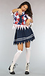 Dit kostuum bestaat uit een bebloed shirt welke lijkt op een overhemd met stropdas en een gilet eroverheen. Echter is dit maar één topje. De top is helemaal bebloed en lijkt afgescheurd. De rok daarentegen is niet bebloed, maar wel afgescheurd. De set bevat veel stretch en is gemakkelijk aan en uit te trekken.