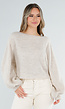 Deze trui is uitgevoerd in een beige fijngebreide stof met een zachte structuur. Het model heeft een losse pasvorm, een boothals en lange ballonmouwen met aansluitende manchetten. De onderzoom is recht afgewerkt en valt tot op de heup.