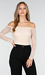 Deze beige top is uitgevoerd in een aansluitend model met off shoulder ontwerp. De lange mouwen en de bovenlaag zijn gemaakt van semi-transparante meshstof met stretcht. Het lijfje is voorzien van een dubbele laag voor extra bedekking, terwijl de mouwen enkel in mesh zijn uitgevoerd.