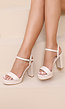 Deze beige sandaletten hebben een brede blokhak, een verhoogde plateauzool en een brede voorband. De enkelband sluit met een verstelbare metalen gesp. De zool, hak en bandconstructie zijn uitgevoerd in een egale beigekleur.