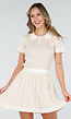 Deze set bestaat uit een aansluitende top en een bijpassende plissé rok in een effen beige kleur. De top heeft korte mouwen, een vaste polokraag en knoopsluitingen aan de voorzijde. Zowel de kraag als de mouwuiteinden zijn afgewerkt met subtiele horizontale strepen. De rok heeft een elastische tailleband en een geplisseerde structuur met streepaccenten langs de zoom. De stof heeft een fijne, gelijkmatige structuur en is rekbaar.