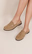 Beige instap muiltjes met een gesloten neus en open hiel. Voorzien van een platte zool en een instapmodel zonder sluiting.