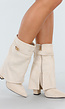 Deze zwarte enkellaarzen hebben een puntige neus en een middelhoge schacht met een brede omslag. Aan de zijkant bevindt zich een goudkleurig metalen detail. De laarzen zijn uitgevoerd in een suède-achtig materiaal met een stevige hak en een smalle pasvorm rond de voet. De zool is licht profiel en de schacht valt soepel naar beneden voor een volumineus effect.