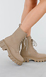 Deze beige veterlaarzen hebben een enkelhoge schacht met ronde neus en zijn voorzien van een grove, profielzool in bijpassende kleur. De schoenen hebben een vetersluiting aan de voorzijde en een functionele rits aan de binnenzijde voor gemakkelijk aan- en uittrekken. Het materiaal heeft een gladde lederlook afwerking en de zool is robuust uitgevoerd voor extra grip.