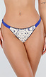 Dit bikini broekje heeft een gehaakte voorzijde met een wit patroon en een blauwe onderlaag. De tailleband is uitgevoerd in effen blauw materiaal. Het broekje heeft een lage taille en een smalle pasvorm aan de zijkanten.