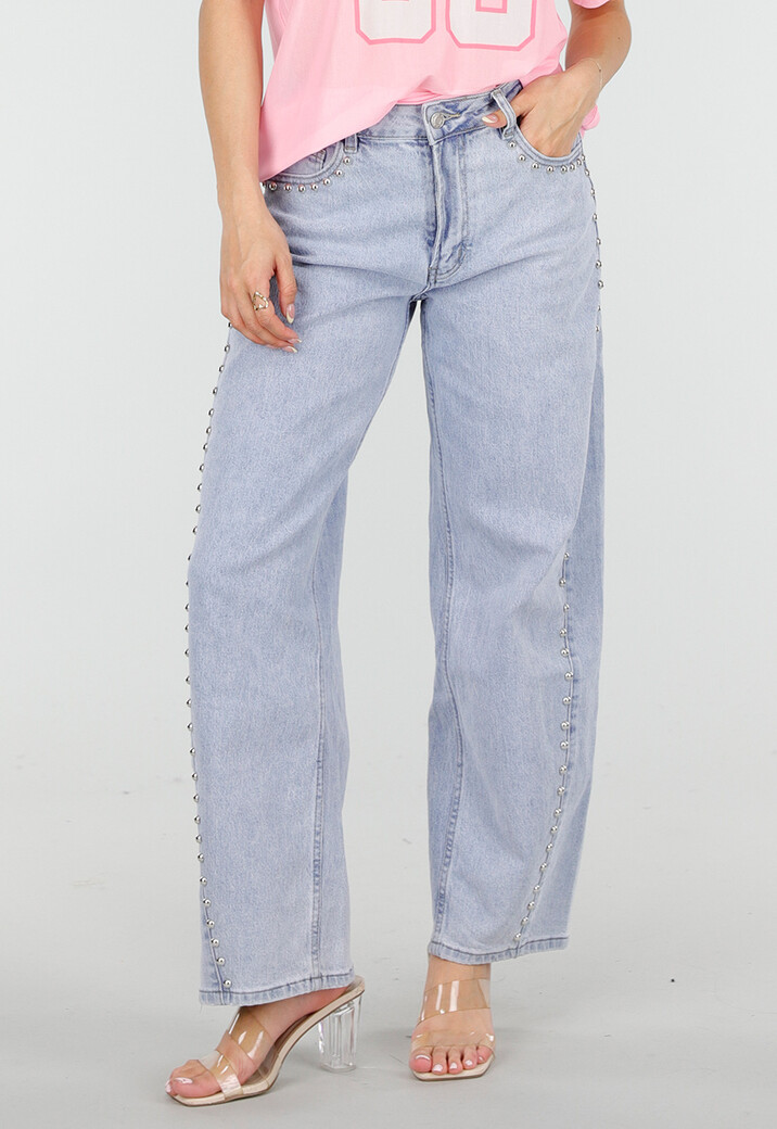 Lichtblauwe denim jeans met een barrel pasvorm. Het model heeft een middelhoge taille met knoop- en ritssluiting en is voorzien van steekzakken en achterzakken. Langs de zakken en zijkanten zitten metalen studs verwerkt. De stof bevat lichte stretch voor extra draagcomfort.