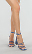 Deze sandalen zijn uitgevoerd in een denimachtige blauwe kleur en hebben een strak design met meerdere dunne bandjes over de voet. De vierkante neus en de hoge blokhak geven het model een moderne uitstraling. Rond de enkel lopen verstelbare wikkelbandjes die vastgezet worden met een kleine gesp. Het materiaal heeft een denim uitstraling. De hakken zijn geschikt voor zomerse gelegenheden, citytrips of een casual avondlook.