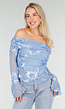 Deze top is uitgevoerd in lichtblauw mesh materiaal met een transparante structuur. Het model heeft een off shoulder halslijn waarbij beide schouders vrij liggen. De top is voorzien van lange, licht uitlopende mouwen van mesh. Over het gehele oppervlak zijn vaste bloemapplicaties aangebracht die zichtbaar reliëf geven. De pasvorm sluit aan op het bovenlichaam en de lengte valt over de taille, met een asymmetrische, puntige zoom aan de voorzijde.