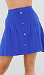 Deze rok is uitgevoerd in een blauwe stof en heeft een korte lengte. Het model is voorzien van vaste plooien rondom, wat zorgt voor een gelijkmatige vorm. Aan de voorzijde zijn meerdere goudkleurige sierknopen geplaatst als detail. De rok heeft een aangesloten tailleband en loopt licht uit naar beneden. De stof is glad en behoudt zijn vorm door de plooiconstructie.