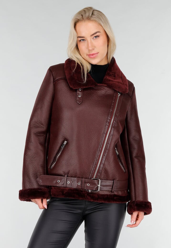 Deze jas is uitgevoerd in bordeauxrood imitatieleer met een matte, licht generfde structuur. Het model heeft een schuine ritssluiting aan de voorzijde en een opstaande kraag die is afgewerkt met een zachte faux fur voering. De jas is voorzien van lange mouwen, een tailleband met verstelbare gesp en twee steekzakken met ritssluiting aan de voorkant. Langs de kraag, de zoom en de mouwen is de faux fur afwerking zichtbaar verwerkt. De tailleband loopt door standaard riemlusjes op de jas. Aan de achterkant zit daarnaast aan de binnenzijde een extra lusje met knoopsluiting waarmee je de riem vastzet, zodat de riem niet uit de jas kan glijden.