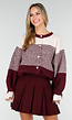 Dit bordeaux vest heeft een gestreept middenpaneel in beige en bordeaux tinten. Het vest sluit met ronde knopen aan de voorzijde. De boorden aan de hals, mouwen en zoom zijn contrasterend afgewerkt in beige. De mouwen zijn lang en ruimvallend met een ribafwerking aan de uiteinden.