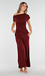 Deze set is uitgevoerd in een bordeaux stretchstof en bestaat uit een aangesloten top met asymmetrische off shoulder halslijn en korte mouw. De top is voorzien van plooidetails rond de taille en heupen. De bijpassende broek heeft een hoge taille en rechte, wijd uitlopende pijpen. De elastische tailleband zorgt voor extra draagcomfort. De stof is rekbaar en valt soepel langs het lichaam.