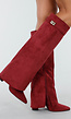 Deze bordeaux rode laarzen zijn uitgevoerd in een suèdelook materiaal met een zachte textuur. De schacht valt wijd en loopt uit in een overlap die losjes over de wreef valt. De laars is voorzien van een spitse neus en een stevige blokhak. Aan de buitenzijde is een riemdetail met goudkleurige gesp zichtbaar. De binnenzijde is uitgerust met een rits voor gemakkelijk aantrekken.