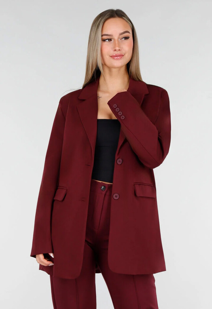 Deze blazer is uitgevoerd in een burgundy, gladde stof met stretch. Het model heeft een rechte, oversized pasvorm, schoudervullingen en een klassieke reverskraag. De blazer sluit met twee knopen aan de voorzijde en is voorzien van twee klepzakken op de voorzijde. De mouwen zijn lang en recht afgewerkt met een splitje aan de achterkant.