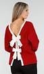 Deze rode gebreide trui is uitgevoerd in een ribstructuur en voorzien van een contrasterende witte rand langs de ronde halslijn. De lange mouwen hebben brede manchetten en vallen recht langs de armen. Deze trui kan op twee manieren gedragen worden: met de strikken aan de voorkant voor een diepe V-hals of juist met de strikken op de rug voor een klassieke ronde hals aan de voorkant.
