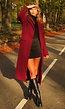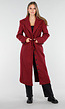 Deze lange manteljas is uitgevoerd in een licht gemêleerde bordeauxrode kleur. De jas heeft een recht en iets getailleerd silhouet en valt lang. De voorzijde sluit met een rij zwarte knopen en bevat twee klepzakken ter hoogte van de heupen en een borstzak. De mantel is voorzien van een klassieke reverskraag en heeft decoratieve knoopdetails aan de mouwuiteinden. Het materiaal heeft een licht wollige uitstraling en stevige structuur.