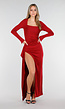 Deze bordeauxrode maxi jurk is gemaakt van een stretchstof en heeft een aansluitende pasvorm. De jurk heeft een vierkante halslijn, lange mouwen en een hoge split aan één zijde. De stof is glad en valt strak langs het lichaam. De onderkant heeft een lichte plooi waardoor de zoom soepel meebeweegt.