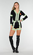 Stoer brandweer kostuum in de vorm van een aansluitende playsuit met lange mouwen. De zwarte stof is afgewerkt met neongele en reflecterende strepen langs het lijf en de mouwen. De playsuit heeft een ritssluiting middenvoor en een verstelbare riem in de taille voor een perfecte pasvorm. De banden op de armen zijn los te halen en sluiten met klittenband. Gemaakt van zachte stretchstof die comfortabel draagt en mooi aansluit op het lichaam. Ideaal voor themafeesten, carnaval of beroepenparty’s.