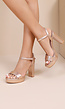Deze bronskleurige sandaletten hebben een brede blokhak, een verhoogde plateauzool en een brede voorband. De enkelband sluit met een verstelbare metalen gesp. De zool, hak en bandconstructie zijn uitgevoerd in een metallic bronskleur.