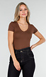 Deze bruine bodysuit is gemaakt van zachte, elastische stretchstof die nauw aansluit op het lichaam. Het model heeft korte mouwen en een V-hals met een gladde afwerking. De stof is licht en soepel, waardoor de body comfortabel aanvoelt en goed meebeweegt. De onderzijde heeft een hoge uitsnede en sluit met drukknopen.