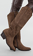 Deze cowboyboots zijn uitgevoerd in een bruine suède look stof. Het model heeft een halfhoge schacht tot onder de knie met een kenmerkende V-vorm aan de bovenzijde. De laarzen zijn voorzien van een licht spitse neus en een schuine blokhak. Aan de binnenzijde bevindt zich een ritssluiting. De zool is vlak afgewerkt met een vaste hakconstructie.