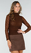 Deze bruine top is gemaakt van fijn stretchkant met een transparant bloemenpatroon. De top heeft een subtiele opstaande halslijn en lange, see through mouwen. Het voorpand is gevoerd en heeft een gedrappeerd effect dat zichtbaar over de buik valt. de mouwen zijn volledig doorschijnend.