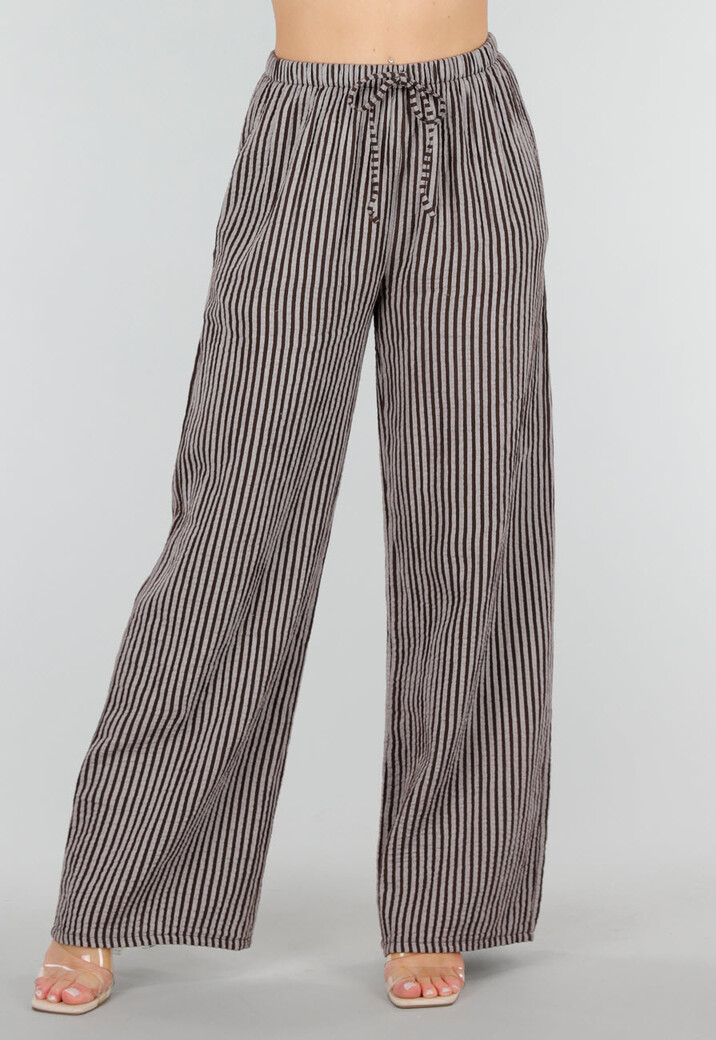Deze broek is gemaakt van een luchtige linnenlook stof met lichte stretch. De tailleband is volledig elastisch en afgewerkt met een sierstrik aan de voorkant. De broek heeft een high waist fit, een straight fit en is hij voorzien van verticale strepen. Ook heeft hij twee steekzakken aan de voorkant. Perfect voor een dagje strand of een avondje uit.