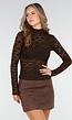 Deze bruine top is uitgevoerd in een rekbare kantstof met een bloemachtig patroon. De stof is volledig transparant. Het model heeft lange mouwen en een smalle colkraag. De top valt recht langs het lichaam en heeft een licht aansluitende pasvorm.