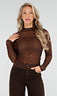 Bruine kanten top met hoge ronde hals en lange mouwen. De doorschijnende kantstof zorgt voor een elegante uitstraling. Dankzij de stretch sluit de top mooi aan op het lichaam.