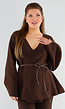 Deze bruine overslag trui heeft een kimono-stijl en een soepele pasvorm. De Trui is gemaakt van een zachte, iets gestructureerde stof en sluit met een dunne leren ceintuur die de taille subtiel accentueert. De trui heeft wijde ballonmouwen. De diepe V-hals maakt dit ontwerp perfect combineerbaar met een top of body eronder. Ideaal voor zowel zakelijke als casual looks.