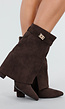 Deze laarzen zijn uitgevoerd in een bruine suède look stof. Het model heeft een puntige neus en een blokhak. De schacht is voorzien van een overslag die losjes om het been valt. Aan de bovenzijde bevindt zich een kleine goudkleurige gesp als detail. De laarzen hebben een binnenrits voor het aan- en uittrekken.