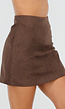 Deze rok is uitgevoerd in een diepe bruine kleur en heeft een zachte suèdelook afwerking. Het model valt kort op het bovenbeen en heeft een effen, strak design zonder zichtbare details aan de voorkant. De stof voelt fluweelachtig aan. Aan de zijkant zit een blinde ritssluiting.