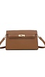 Deze bruine schoudertas is gemaakt van een gestructureerd materiaal met leerlook en heeft een rechthoekige vorm. De tas heeft een afmeting van 27 x 16 x 7 cm en een gewicht van 0,52 kg. Op de voorzijde bevindt zich een smalle klep met goudkleurige draaivergrendeling die zorgt voor een stevige sluiting. De afneembare en verstelbare schouderband maakt het mogelijk de tas zowel crossbody als over de schouder te dragen. De strakke naden en het minimalistische ontwerp geven de tas een nette uitstraling, terwijl de goudkleurige accenten zorgen voor een subtiel detail.