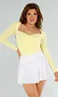 Deze butter yellow top heeft een aansluitende fit en is voorzien van lange mouwen. De halslijn is uitgevoerd in een sweetheart-vorm met een subtiele overslag aan de voorkant. De stof is glad, rekbaar en glanzend. De top is effen zonder patronen of opdrukken en heeft een rechte zoom die op de heup valt. De achterkant heeft een ronde halslijn.