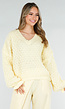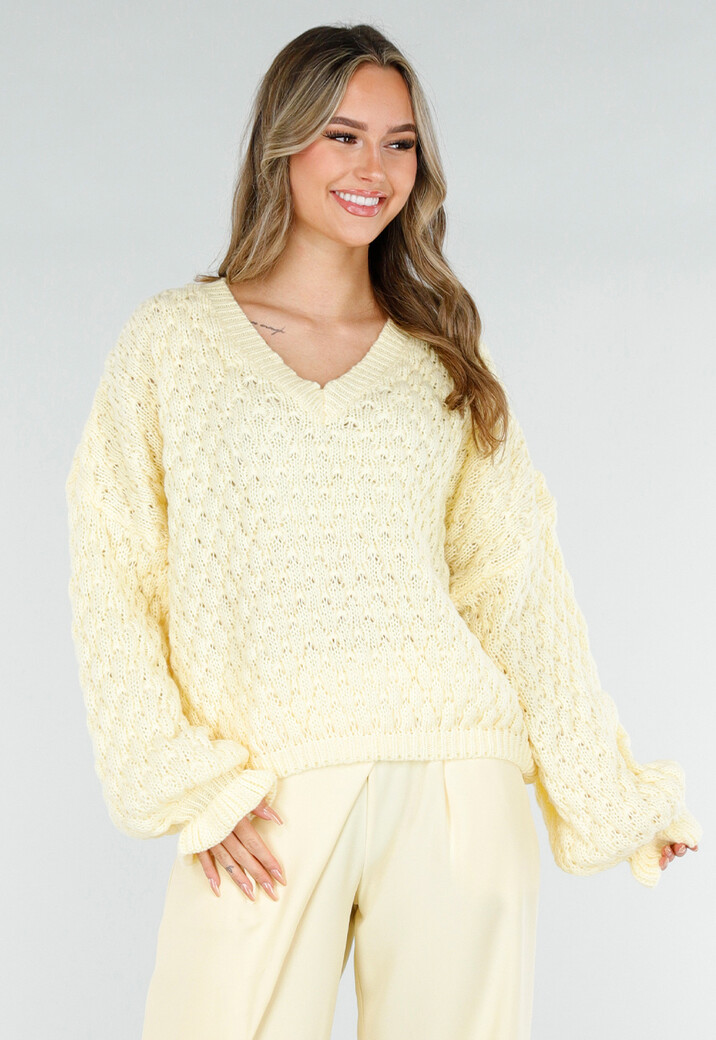 Deze lichtgele trui is uitgevoerd in een grofgebreide structuur met opengewerkt patroon. Het model heeft een V-hals met geribde boord en lange mouwen. De mouwen zijn ruim gesneden en afgewerkt met geribde manchetten. De onderzijde is voorzien van een geribde zoom. De pasvorm valt los om het lichaam en de lengte reikt tot op de heup.