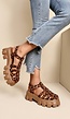 Bruine sandalen met luipaardprint en meerdere banden over de voet. Voorzien van een verstelbare gesp aan de zijkant en een open neus. Gemaakt van suède materiaal met een dikke zool en grof profiel.
