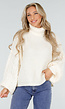 Deze crèmekleurige coltrui is vervaardigd uit grofgebreid materiaal en heeft een hoge omgeslagen col. De ballonmouwen zijn voorzien van een duidelijk zichtbaar kabelpatroon dat contrasteert met het ribbreisel van de body. De trui heeft een losse, rechte pasvorm en valt tot op de heup.