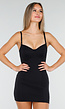 Deze zwarte shapewear onderjurk is ontworpen in een aansluitende stretchstof voor een corrigerend effect. De cups zijn verstevigd met beugels en bieden extra ondersteuning. De jurk heeft verstelbare spaghetti bandjes en een diepe halslijn. Het model is kort en valt boven de knie. De naden zijn subtiel weggewerkt waardoor de jurk glad aansluit onder kleding. Onder de jurk bevindt zich een geïntegreerde body met drukknopen.