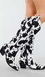 Deze cowboylaarzen zijn uitgevoerd in een opvallende zwart-witte koeienprint. De schacht heeft aan beide zijden lussen en een rits aan de binnenzijde voor gemakkelijk aan- en uittrekken. De stof heeft een gladde afwerking. De hak is stevig, breed en uitgevoerd in zwart. De neus is licht spits en afgerond, wat zorgt voor een klassieke westernvorm.