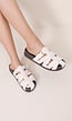 Crème slippers met meerdere brede bandjes over de voet. Voorzien van verstelbare gespen voor een aanpasbare pasvorm. De slippers hebben een platte zool en een open teen.