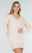 Deze crèmekleurige gebreide trui jurk heeft een zachte, warme stretchstof en een comfortabele losse pasvorm. De V-hals aan de voorkant zorgt voor een elegante uitstraling, terwijl de rug is afgewerkt met een satijnachtige strik.
