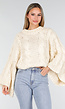 Deze hand made cremekleurige trui heeft een grofgebreide structuur met een opvallend kabelpatroon. De oversized pasvorm en wijdvallende lange mouwen geven de trui een cozy en trendy uitstraling. De ronde hals maakt het ontwerp tijdloos en perfect voor warme, comfortabele winterlooks.