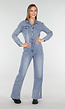 Deze jumpsuit is uitgevoerd in blauw denim en heeft een recht silhouet met wijde pijpen. Het model is voorzien van een kraag en een volledige knoopsluiting aan de voorzijde. Op de borst is een opgestikte borstzak geplaatst. De mouwen zijn lang en kunnen worden omgeslagen. De jumpsuit heeft een rechte pasvorm over het lichaam en loopt wijd uit vanaf de heup tot aan de zoom.