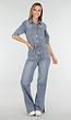 Deze jumpsuit is uitgevoerd in blauw denim en heeft een rechte pasvorm met wijde pijpen. Het model is voorzien van een kraag en knoopsluitingen aan de voorzijde. Op de borst zijn twee opgestikte borstzakken geplaatst en aan de voorzijde bevinden zich steekzakken. De mouwen zijn halflang en recht afgewerkt. De taille is elastisch uitgevoerd en voorzien van een aantrekkoord, waardoor de pasvorm rond de taille verstelbaar is. De pijpen vallen lang en recht naar beneden.
