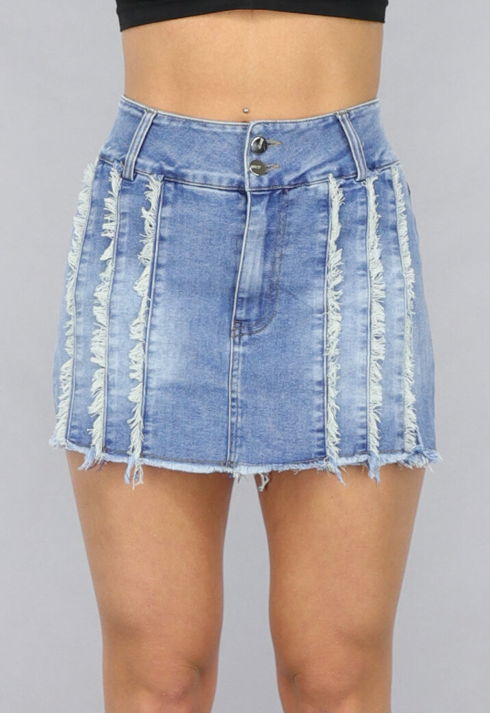 Deze skort is gemaakt van een denim stretch stof. Hij heeft een high waist model. Het item lijkt op een rokje, maar is daadwerkelijk een broekje. Het skortje is voorzien van een brede tailleband met vijf riemlusjes waar je een riem doorheen kunt halen. De skort is voorzien van een ritssluiting met een dubbele knoopsluiting en hij is voorzien van twee kontzakken. Op de voorkant heeft hij zes naden met een lichte rafel.