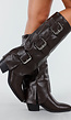 Deze bruine laarzen zijn uitgevoerd in een matglanzend imitatieleer met een rechte schacht die tot onder de knie reikt. De schacht is voorzien van drie brede bandjes met grote zilverkleurige gespen aan de buitenzijde. De laars heeft een stevige blokhak en een iets spits toelopende neus. De schacht heeft een extra flapafwerking die over de wreef valt.