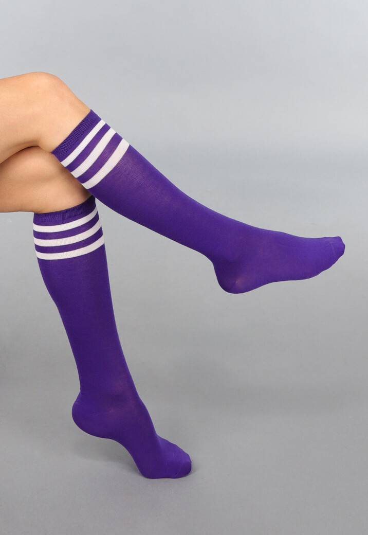 Deze sokken vallen tot onder de knie en zijn gemaakt van een stretchy stof. Ze zijn paars van kleur en voorzien van drie witte strepen aan de bovenkant.
