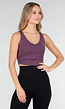 Deze donkerpaarse sporttop is gemaakt van een gladde, elastische stretchstof die perfect aansluit op het lichaam. De top heeft brede schouderbanden, een diepe ronde halslijn en een iets verlengde zoom die comfortabel op de taille valt. Dankzij de stevige maar soepele stof biedt de top optimale ondersteuning tijdens beweging zonder in te snijden.
